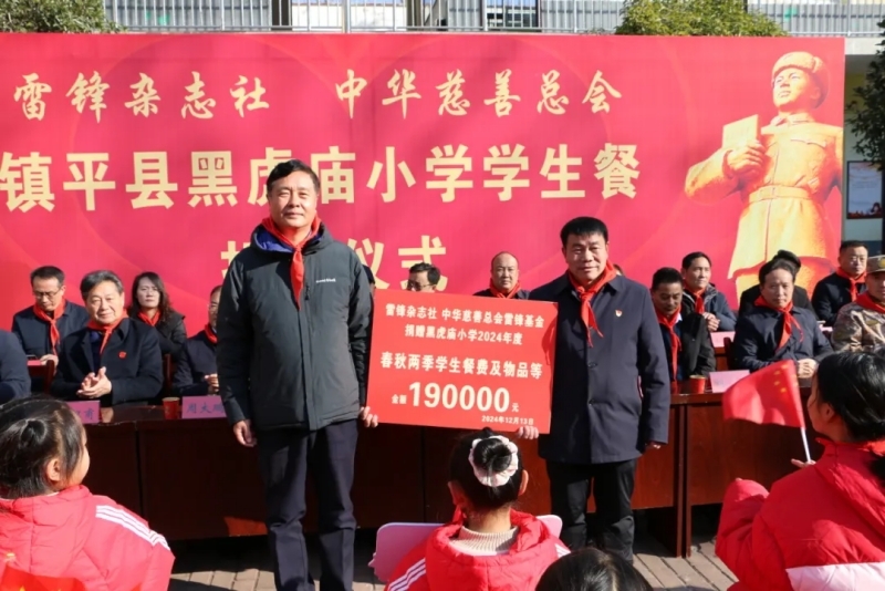 在镇平县高丘镇黑虎庙小学的活动现场,气氛庄重而热烈。捐赠仪式在全场奏唱雄壮的国歌声中拉开序幕。与会领导将雷锋杂志社、中华慈善总会雷锋基金筹集的社会各界爱心捐款十九万元捐赠给黑虎庙小学,用于学校2024年度春秋两季学生餐费及学习物品费用,并为爱心企业代表颁发证书,勉励同学们要将雷锋精神发扬光大、好好学习,将来为祖国建设做贡献。张玉滚代表黑虎庙小学全体师生对爱心捐赠表示感谢。活动在全场高唱《学习雷锋好榜样》的歌声中落下帷幕。