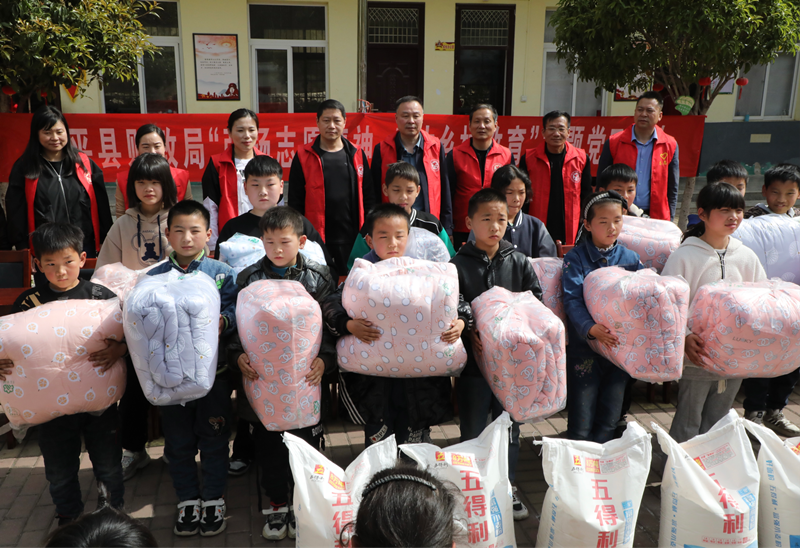 4月12日,镇平县财政局组织党员干部20余人走进“时代楷模”张玉滚所在的镇平县高丘镇黑虎庙小学,开展“弘扬志愿服务精神 助力乡村教育”主题党日活动,同时为该校师生送去米、面、被子等慰问物资。