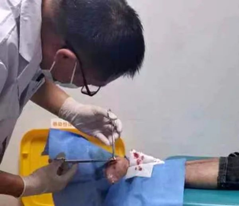 由于漂流河道水流湍急,乱石嶙峋,殷春强浑身上下伤痕累累,血流不止。同事们赶紧把他的护袖脱下为他包扎止血,并搀扶他到景点医务室做了简单处理,随后赶回镇平县人民医院进行了伤口缝合。