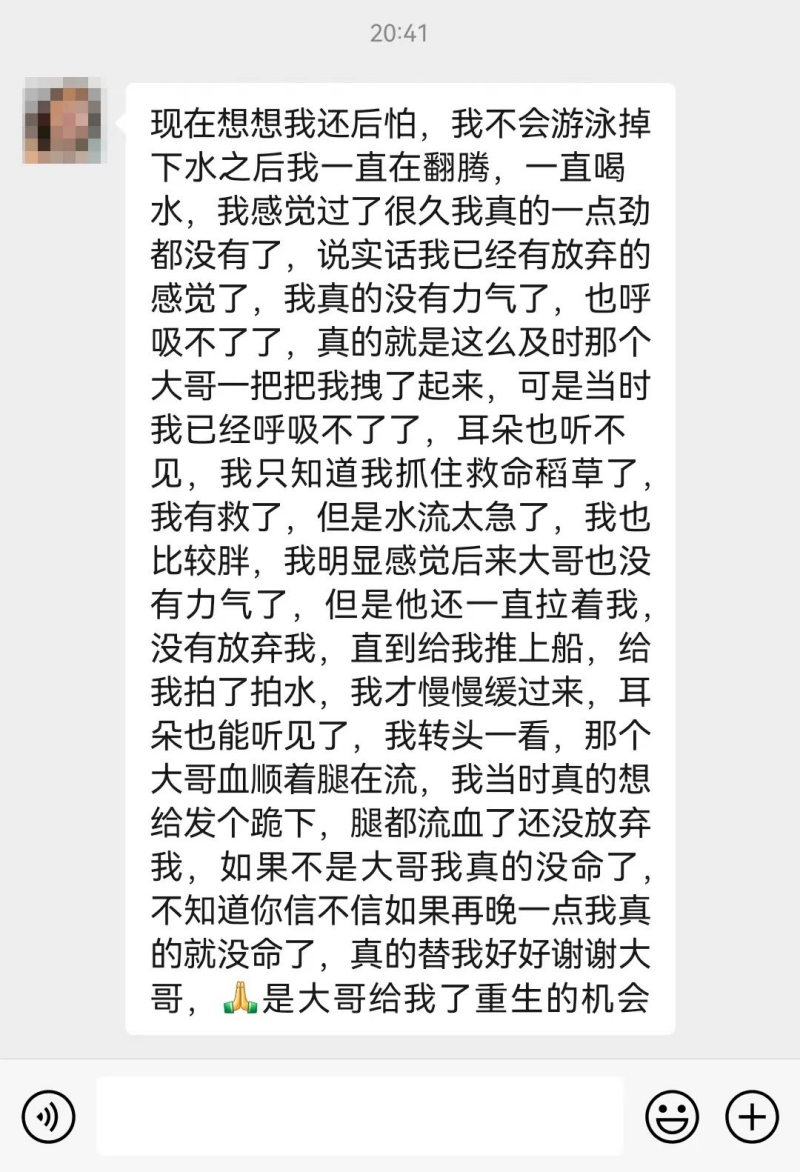 “是有人落水了!”当落水女子被激流冲近他们船时,殷春强没有多想,飞身跳入水中,想第一时间抓住落水者,但由于此段水流湍急,没有成功。