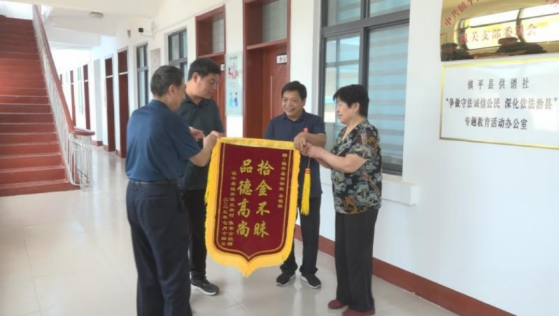 7月14日上午,年迈八旬的李春敖、张福勤夫妇来到镇平县供销社,将一面“拾金不昧  品质高尚”的锦旗送到供销社职工李银宗手中,感激之情溢于言表。