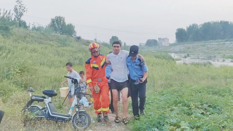 此时,岸边一名男青年听到呼救声,狂奔到河边,发现小女孩的两个同伴慌乱中下河救人,已经离岸一两米远了,男子赶忙制止让他们回去。看到河里越漂越远的小女孩,男子连衣服鞋子都没来得及脱,直接跳进河里。他连喝了好几口水,艰难游到小女孩身边,一把将小女孩从水中抱起。可是水面太大,水流也很急,往岸边游时,男子已经体力不支。他稳了稳自己的身体,托着小女孩尝试走水浅的地方一步一步往岸边挪。两人随时有可能被水冲走,岸上一名群众看到后立即报警。