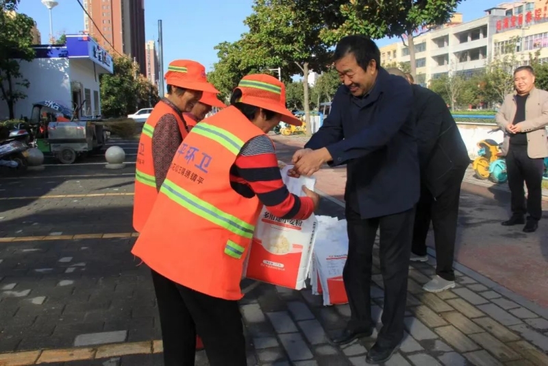 在慰问现场,郝肖天副院长与环卫工人亲切交谈:“环卫工作很辛苦,你们作为‘城市美容师’,每天早出晚归、风雨无阻,不怕脏、不怕苦、不怕累,爱岗敬业,勤奋工作,为镇平城区清洁和环境美化做出巨大贡献,同时叮嘱他们在工作中要注意防寒保暖,保重身体,注意安全,并祝他们节日快乐!”
