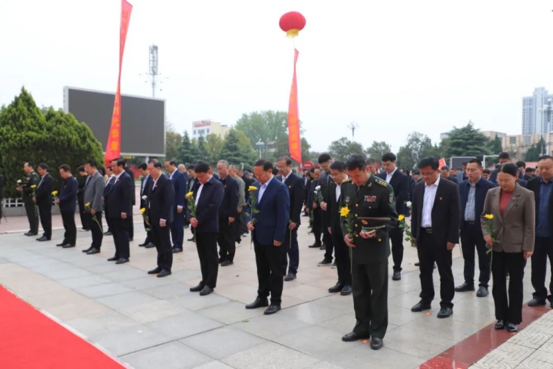 苍松翠柏掩映下的彭雪枫纪念馆庄严肃穆,彭雪枫将军铜像巍然耸立,全县各界代表面向将军铜像集体肃立。全场奏唱中华人民共和国国歌后,全体人员向长眠于此的革命烈士默哀一分钟,表达对烈士的缅怀之情。少先队员献唱《我们是共产主义接班人》。