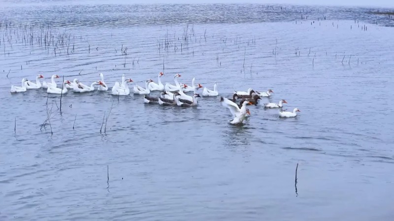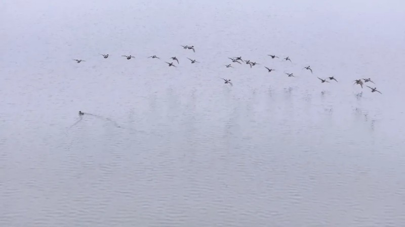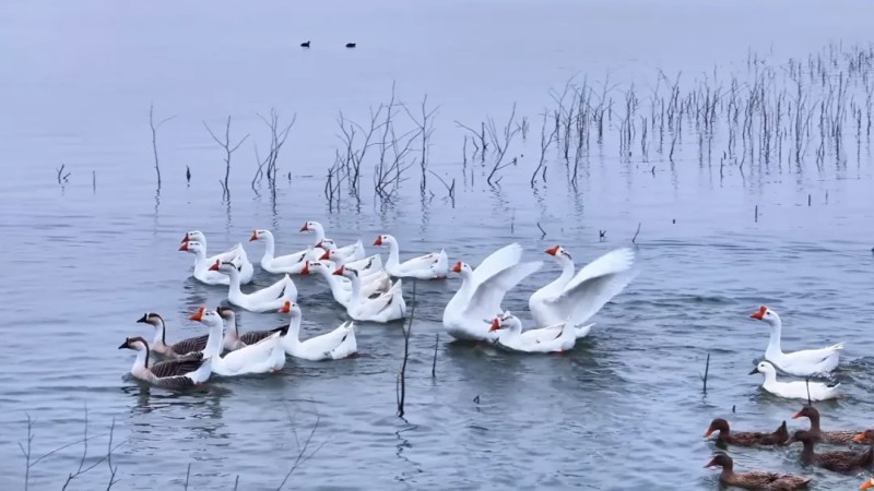 12月11日,镇平县高丘水库,鹅鸭在碧波中尽情嬉戏,飞鸟在蓝天上自由翱翔,共同演绎着冬日的生机与活力。(作者:时君洋)