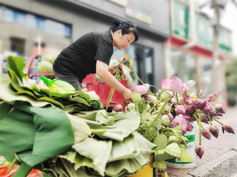 图片摆在路边售卖的荷花、莲蓬(央广网发 时君洋 摄)