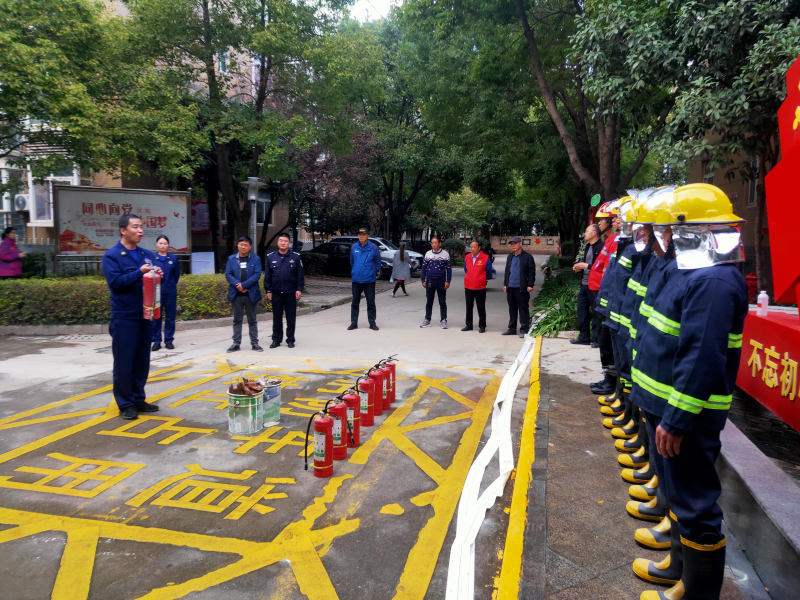 演练开始前,消防员向派出所、社区、物业工作人员及业主普及消防知识,讲解灭火器的使用方法及发生火灾时的正确逃生方法,并就灭火器使用四步法“一提、二拔、三瞄、四压”进行实际操练,模拟火灾现场使用灭火器成功灭火。